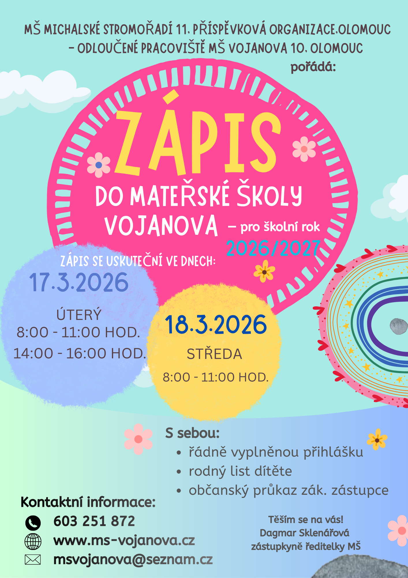 Zápis do MŠ Michalské stromořadí 11, Olomouc - odloučené pracoviště Vojanova 10, Olomouc pro školní rok 2026/2027 se uskuteční: